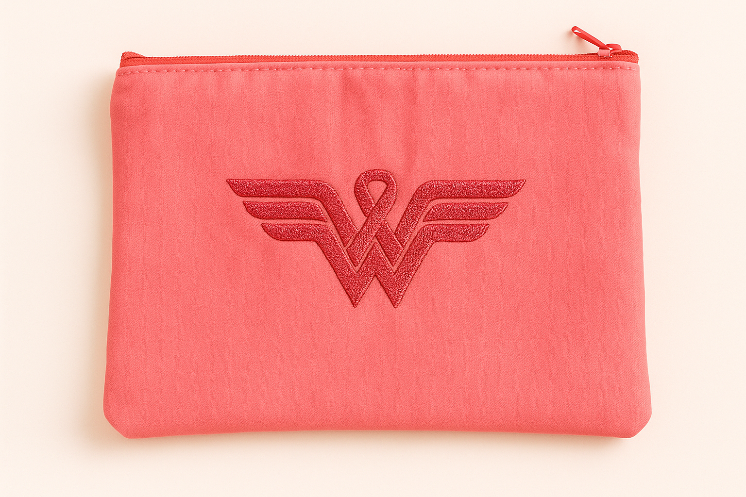 Carry strength, style, and purpose with this handcrafted pink pouch designed for breast cancer awareness. Made from soft, durable fabric with a smooth zipper closure, this pouch is perfect for makeup, essentials, or everyday items. The embroidered Wonder Woman–inspired “W” combined with the breast cancer ribbon symbolizes resilience, empowerment, and hope.